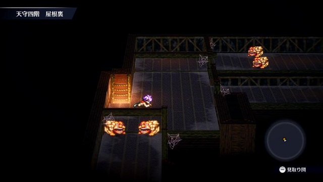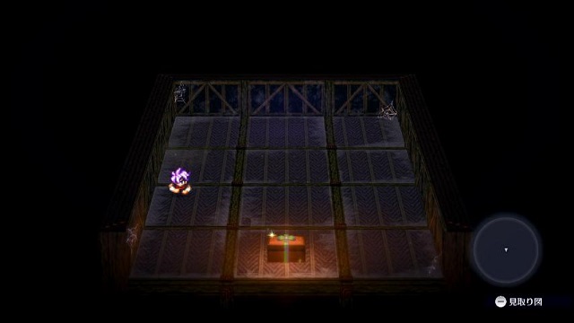 天守二階の屋根裏左下を目指します、宝箱の真上の落とし穴に落ちると宝箱が置いてある部屋に着きます。