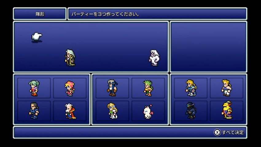 パーティはこんな感じで、後に戦うボスから青魔法を習得したいなら第1か第3パーティにストラゴスを入れましょう。