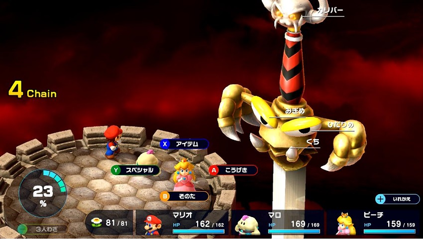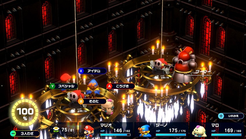 全体魔法攻撃を頻繁に使うので、ピーチの「みんなげんきになあれ」で味方全員のHPを回復しましょう( 一一)b